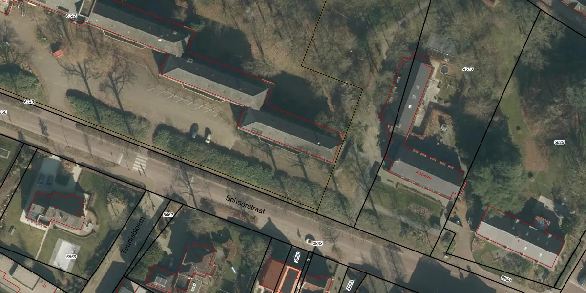 Het perceel waarop Schoorstraat 2-07 staat heeft een oppervlakte van 1,3 ha. Dit is een zeer groot perceel. De perceeloppervlakte wordt geregistreerd door het Kadaster. Gedetailleerde informatie over de maten van dit perceel kunt u vinden in het rapport Kadastrale kaart met maatvoering van Schoorstraat 2-07.