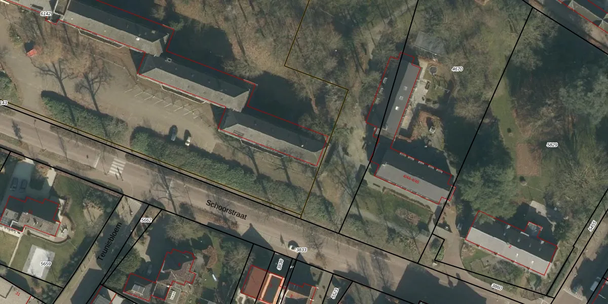 Het perceel waarop Schoorstraat 2-12 staat heeft een oppervlakte van 1,3 ha. Dit is een zeer groot perceel. De perceeloppervlakte wordt geregistreerd door het Kadaster. Gedetailleerde informatie over de maten van dit perceel kunt u vinden in het rapport Kadastrale kaart met maatvoering van Schoorstraat 2-12.
