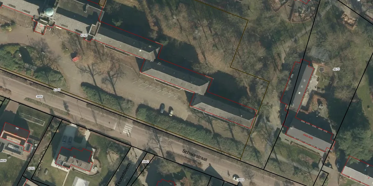 Het perceel waarop Schoorstraat 2-22 staat heeft een oppervlakte van 1,3 ha. Dit is een zeer groot perceel. De perceeloppervlakte wordt geregistreerd door het Kadaster. Gedetailleerde informatie over de maten van dit perceel kunt u vinden in het rapport Kadastrale kaart met maatvoering van Schoorstraat 2-22.