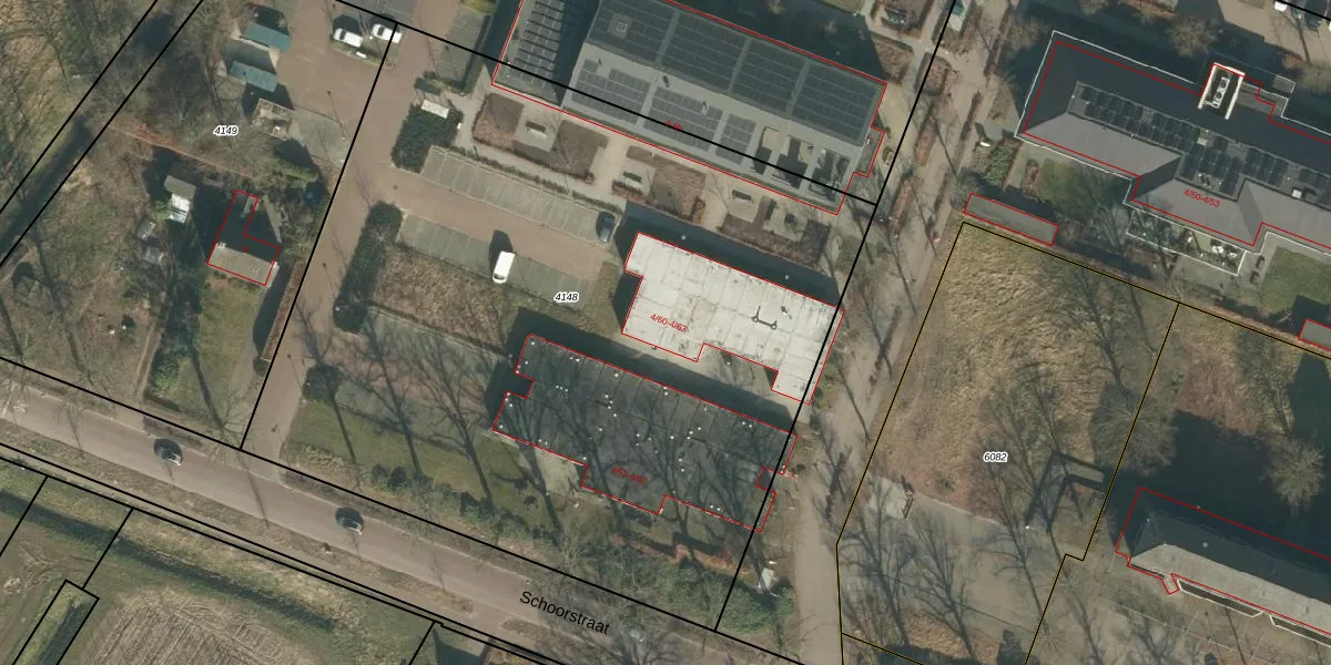Het perceel waarop Schoorstraat 4-63 staat heeft een oppervlakte van 5262 m². Dit is een zeer groot perceel. De perceeloppervlakte wordt geregistreerd door het Kadaster. Gedetailleerde informatie over de maten van dit perceel kunt u vinden in het rapport Kadastrale kaart met maatvoering van Schoorstraat 4-63.