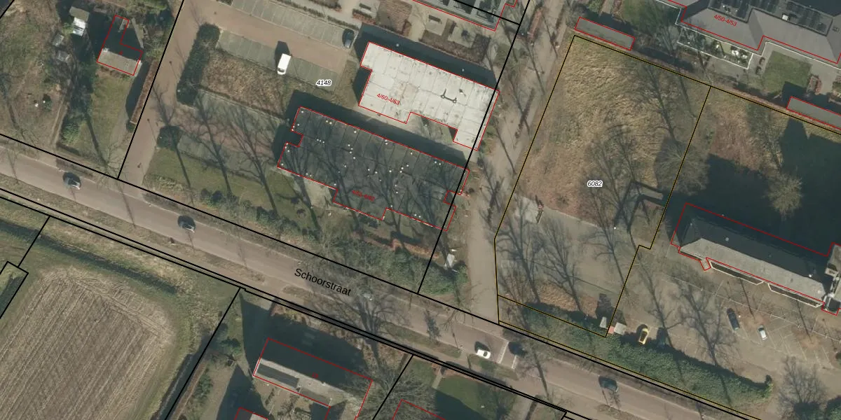 Het perceel waarop Schoorstraat 4-61 staat heeft een oppervlakte van 5262 m². Dit is een zeer groot perceel. De perceeloppervlakte wordt geregistreerd door het Kadaster. Gedetailleerde informatie over de maten van dit perceel kunt u vinden in het rapport Kadastrale kaart met maatvoering van Schoorstraat 4-61.