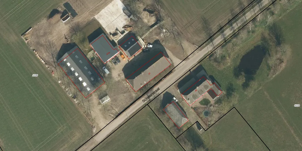 Het perceel waarop Schoorstraat 47 staat heeft een oppervlakte van 2,8 ha. Dit is een zeer groot perceel. De perceeloppervlakte wordt geregistreerd door het Kadaster. Gedetailleerde informatie over de maten van dit perceel kunt u vinden in het rapport Kadastrale kaart met maatvoering van Schoorstraat 47.