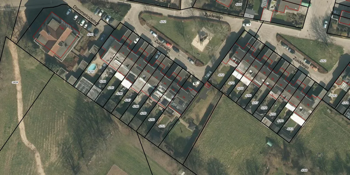 Het perceel waarop Zuidewijn 16 staat heeft een oppervlakte van 266 m². Dit is een middelgroot perceel. De perceeloppervlakte wordt geregistreerd door het Kadaster. Gedetailleerde informatie over de maten van dit perceel kunt u vinden in het rapport Kadastrale kaart met maatvoering van Zuidewijn 16.
