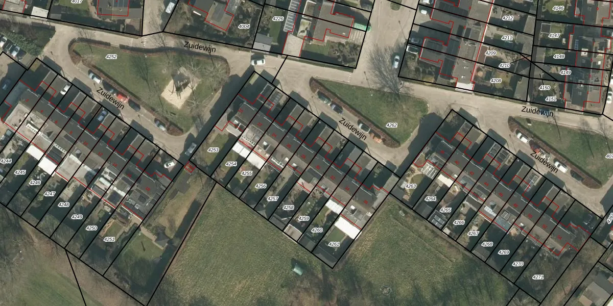 Het perceel waarop Zuidewijn 28 staat heeft een oppervlakte van 217 m². Dit is een middelgroot perceel. De perceeloppervlakte wordt geregistreerd door het Kadaster. Gedetailleerde informatie over de maten van dit perceel kunt u vinden in het rapport Kadastrale kaart met maatvoering van Zuidewijn 28.