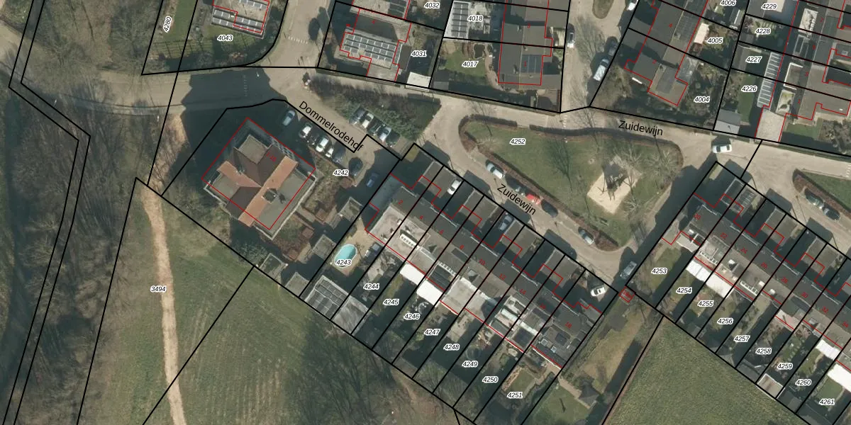 Het perceel waarop Zuidewijn 4 staat heeft een oppervlakte van 266 m². Dit is een middelgroot perceel. De perceeloppervlakte wordt geregistreerd door het Kadaster. Gedetailleerde informatie over de maten van dit perceel kunt u vinden in het rapport Kadastrale kaart met maatvoering van Zuidewijn 4.