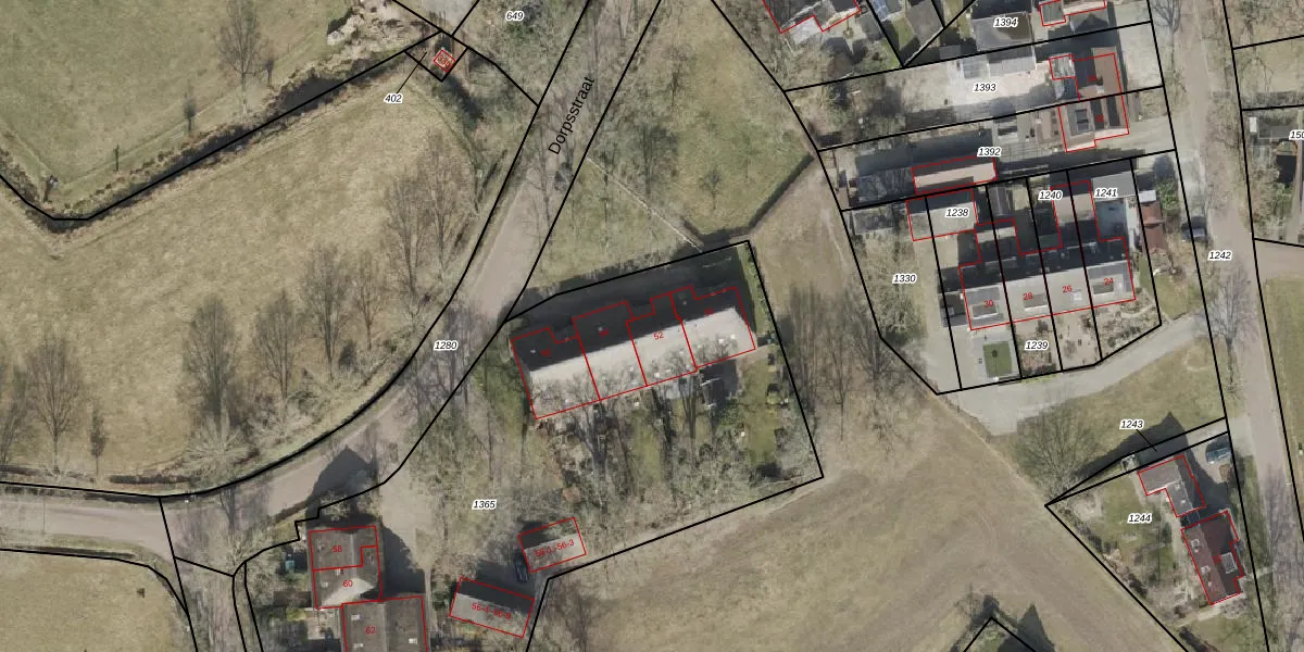Het perceel waarop Dorpsstraat 52 staat heeft een oppervlakte van 4269 m². Dit is een zeer groot perceel. De perceeloppervlakte wordt geregistreerd door het Kadaster. Gedetailleerde informatie over de maten van dit perceel kunt u vinden in het rapport Kadastrale kaart met maatvoering van Dorpsstraat 52.