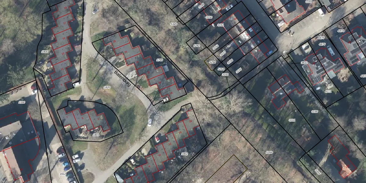 Het perceel waarop Batenburg 18 staat heeft een oppervlakte van 1127 m². Dit is een zeer groot perceel. De perceeloppervlakte wordt geregistreerd door het Kadaster. Gedetailleerde informatie over de maten van dit perceel kunt u vinden in het rapport Kadastrale kaart met maatvoering van Batenburg 18.