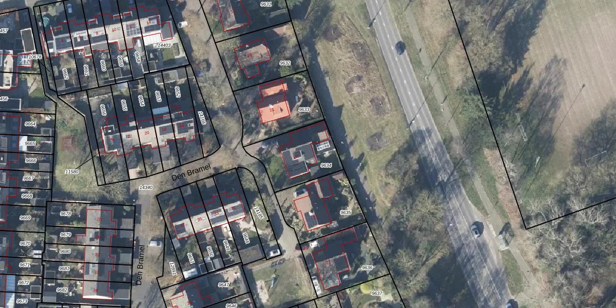 Het perceel waarop Den Bramel 23 staat heeft een oppervlakte van 430 m². Dit is een groot perceel. De perceeloppervlakte wordt geregistreerd door het Kadaster. Gedetailleerde informatie over de maten van dit perceel kunt u vinden in het rapport Kadastrale kaart met maatvoering van Den Bramel 23.