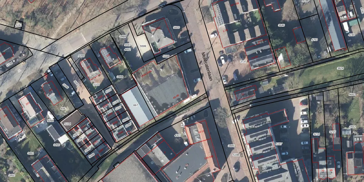 Het perceel waarop Molecatenlaan 4-B staat heeft een oppervlakte van 1227 m². Dit is een zeer groot perceel. De perceeloppervlakte wordt geregistreerd door het Kadaster. Gedetailleerde informatie over de maten van dit perceel kunt u vinden in het rapport Kadastrale kaart met maatvoering van Molecatenlaan 4-B.