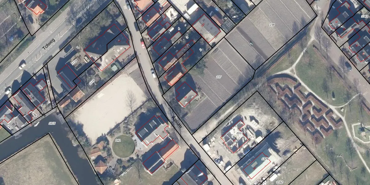 Het perceel waarop Assum 5-a staat heeft een oppervlakte van 1272 m². Dit is een zeer groot perceel. De perceeloppervlakte wordt geregistreerd door het Kadaster. Gedetailleerde informatie over de maten van dit perceel kunt u vinden in het rapport Kadastrale kaart met maatvoering van Assum 5-a.