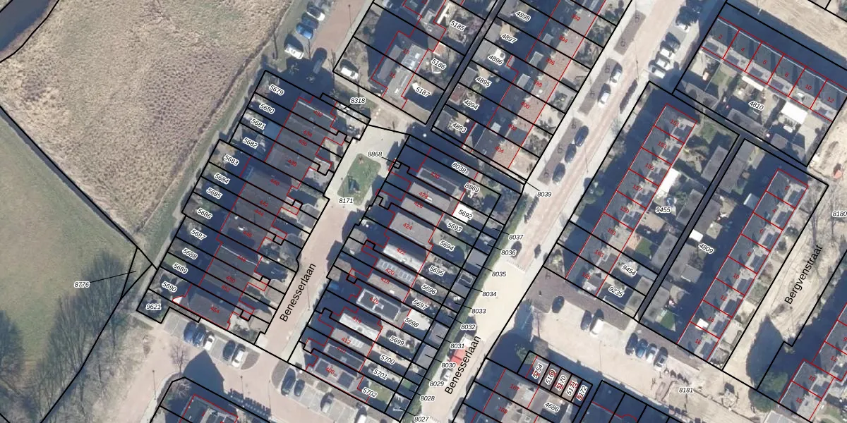 Het perceel waarop Benesserlaan 426 staat heeft een oppervlakte van 107 m². Dit is een middelgroot perceel. De perceeloppervlakte wordt geregistreerd door het Kadaster. Gedetailleerde informatie over de maten van dit perceel kunt u vinden in het rapport Kadastrale kaart met maatvoering van Benesserlaan 426.