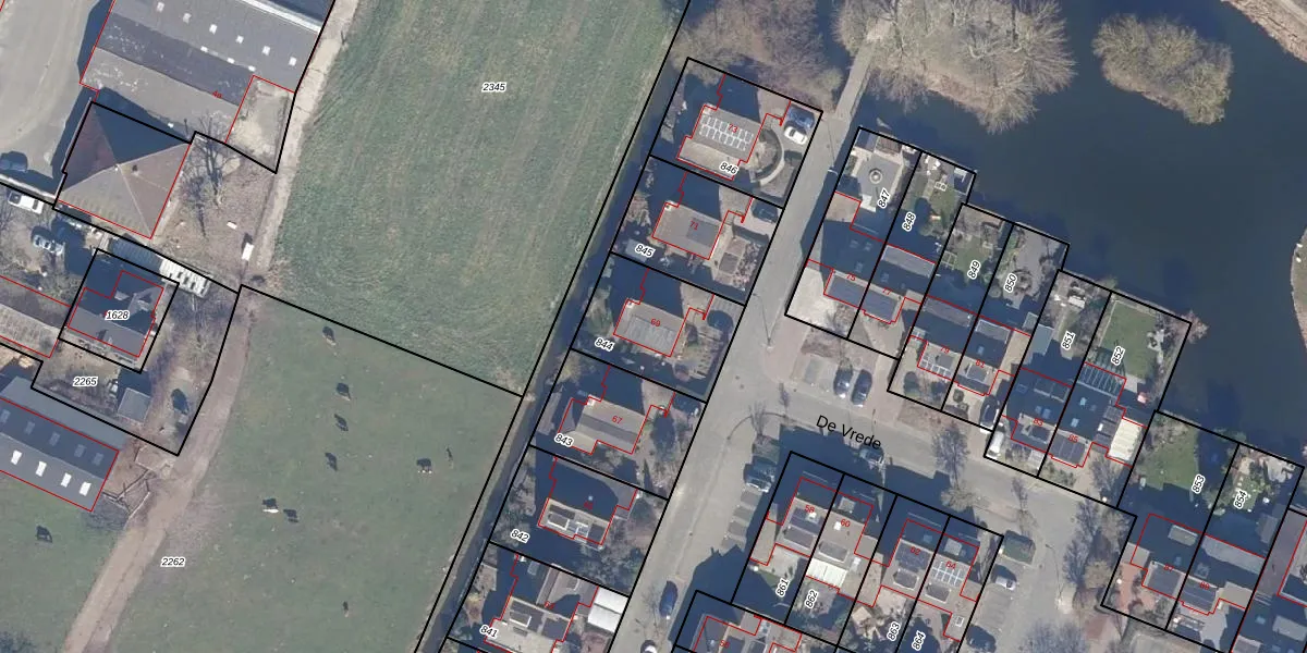 Het perceel waarop De Vrede 69 staat heeft een oppervlakte van 369 m². Dit is een groot perceel. De perceeloppervlakte wordt geregistreerd door het Kadaster. Gedetailleerde informatie over de maten van dit perceel kunt u vinden in het rapport Kadastrale kaart met maatvoering van De Vrede 69.