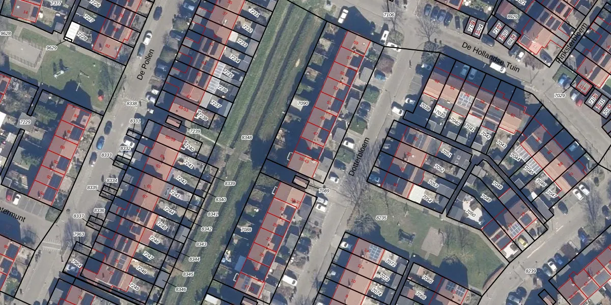 Het perceel waarop Dotterbloem 45 staat heeft een oppervlakte van 1000 m². Dit is een zeer groot perceel. De perceeloppervlakte wordt geregistreerd door het Kadaster. Gedetailleerde informatie over de maten van dit perceel kunt u vinden in het rapport Kadastrale kaart met maatvoering van Dotterbloem 45.