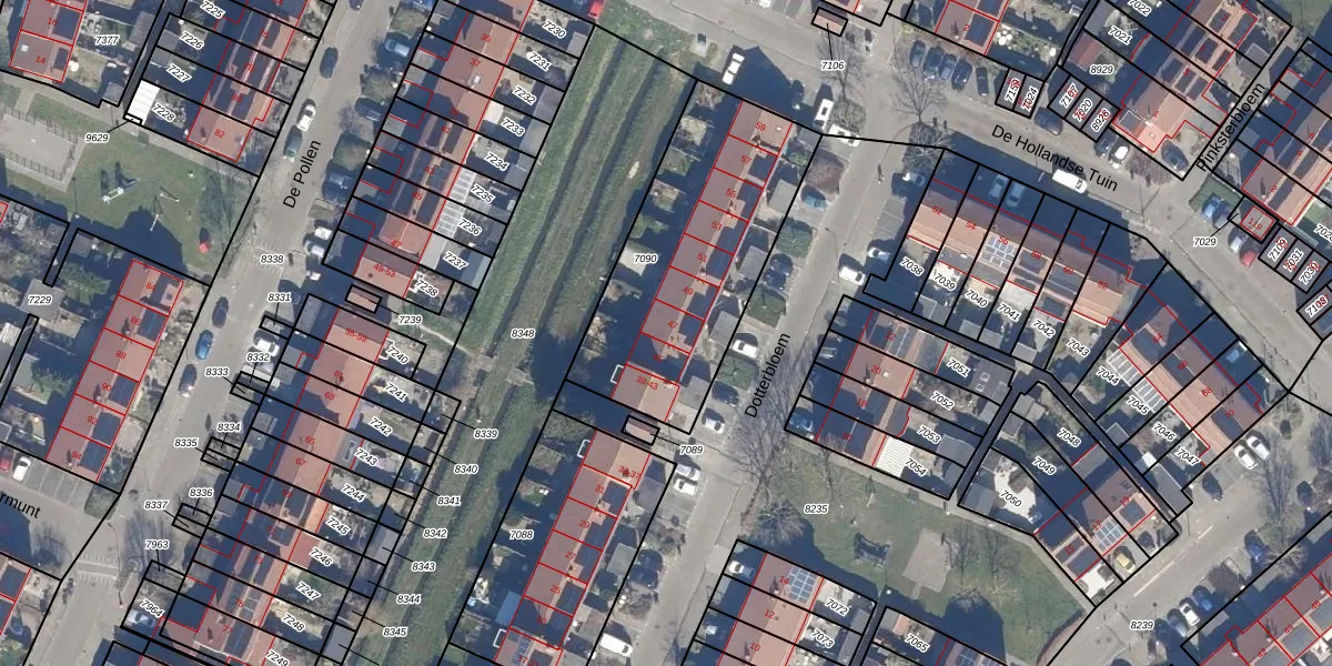Het perceel waarop Dotterbloem 47 staat heeft een oppervlakte van 1000 m². Dit is een zeer groot perceel. De perceeloppervlakte wordt geregistreerd door het Kadaster. Gedetailleerde informatie over de maten van dit perceel kunt u vinden in het rapport Kadastrale kaart met maatvoering van Dotterbloem 47.