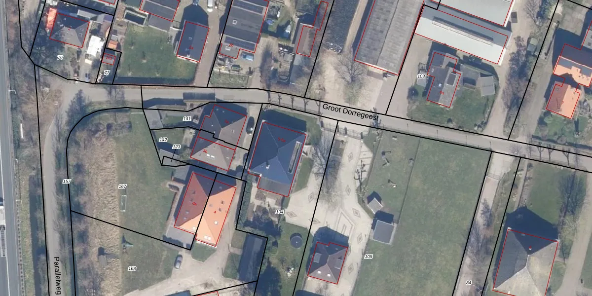 Het perceel waarop Groot Dorregeest 5-a staat heeft een oppervlakte van 1550 m². Dit is een zeer groot perceel. De perceeloppervlakte wordt geregistreerd door het Kadaster. Gedetailleerde informatie over de maten van dit perceel kunt u vinden in het rapport Kadastrale kaart met maatvoering van Groot Dorregeest 5-a.