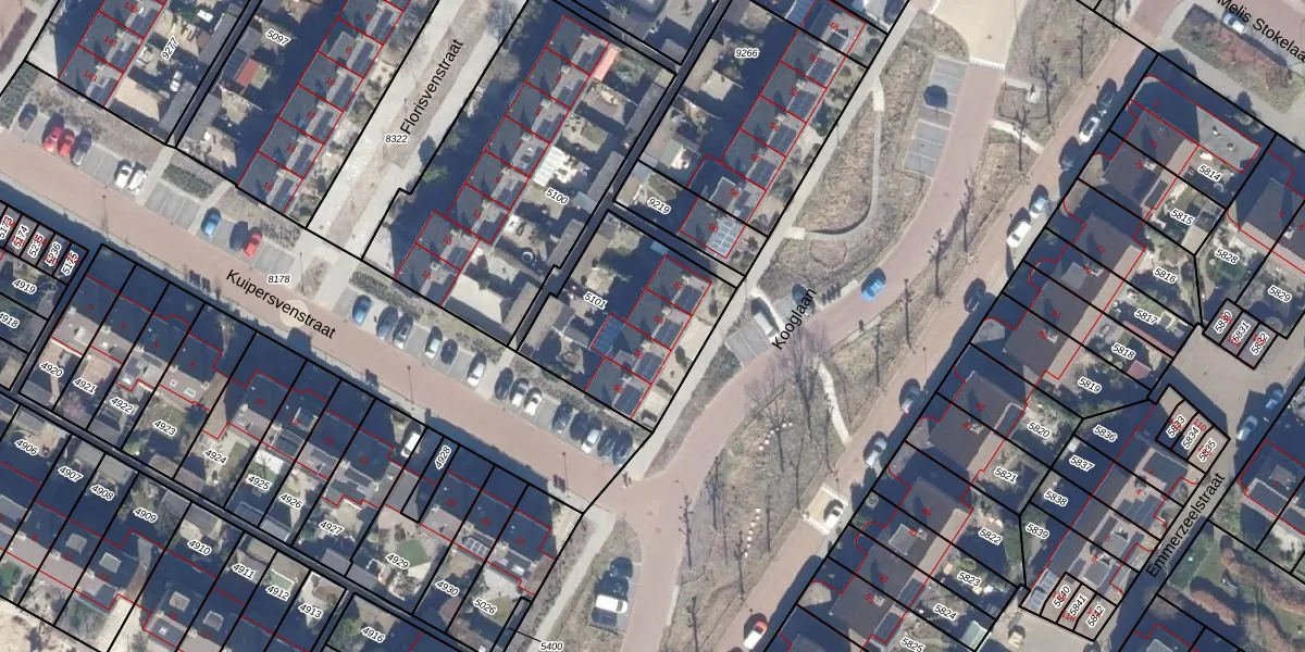 Het perceel waarop Kooglaan 64 staat heeft een oppervlakte van 608 m². Dit is een groot perceel. De perceeloppervlakte wordt geregistreerd door het Kadaster. Gedetailleerde informatie over de maten van dit perceel kunt u vinden in het rapport Kadastrale kaart met maatvoering van Kooglaan 64.