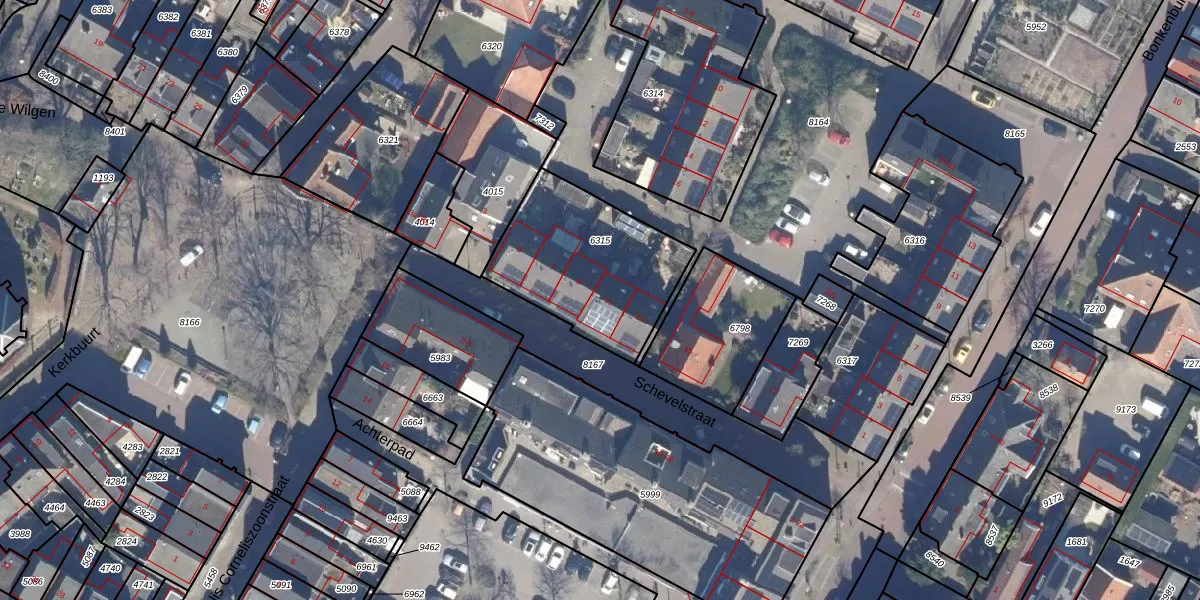 Het perceel waarop Schevelstraat 11 staat heeft een oppervlakte van 619 m². Dit is een groot perceel. De perceeloppervlakte wordt geregistreerd door het Kadaster. Gedetailleerde informatie over de maten van dit perceel kunt u vinden in het rapport Kadastrale kaart met maatvoering van Schevelstraat 11.