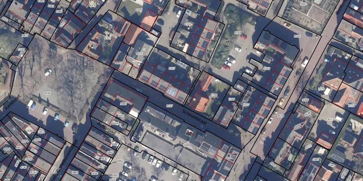 Het perceel waarop Schevelstraat 13 staat heeft een oppervlakte van 619 m². Dit is een groot perceel. De perceeloppervlakte wordt geregistreerd door het Kadaster. Gedetailleerde informatie over de maten van dit perceel kunt u vinden in het rapport Kadastrale kaart met maatvoering van Schevelstraat 13.