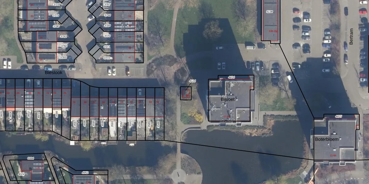 Het perceel waarop Bieslook 98 staat heeft een oppervlakte van 43 m². Dit is een klein perceel. De perceeloppervlakte wordt geregistreerd door het Kadaster. Gedetailleerde informatie over de maten van dit perceel kunt u vinden in het rapport Kadastrale kaart met maatvoering van Bieslook 98.