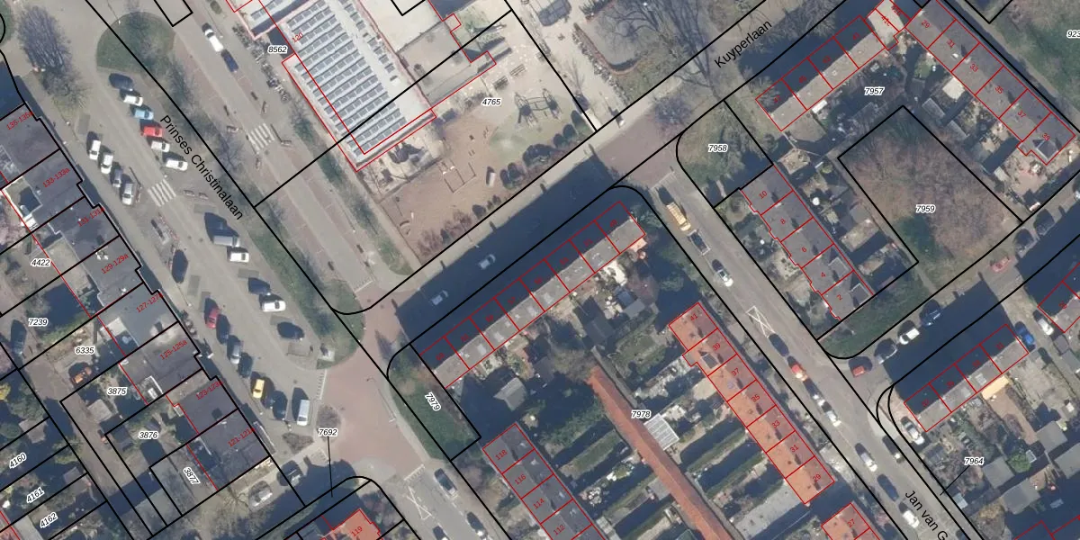 Het perceel waarop Kuyperlaan 55 staat heeft een oppervlakte van 4494 m². Dit is een zeer groot perceel. De perceeloppervlakte wordt geregistreerd door het Kadaster. Gedetailleerde informatie over de maten van dit perceel kunt u vinden in het rapport Kadastrale kaart met maatvoering van Kuyperlaan 55.