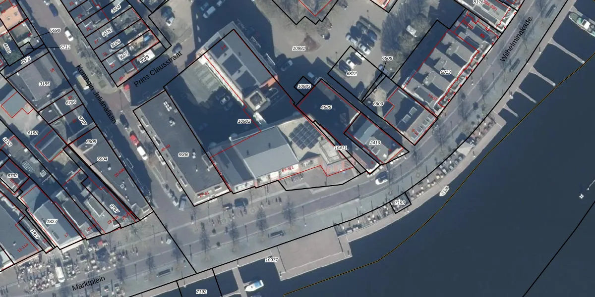 Het perceel waarop Marktplein 107 staat heeft een oppervlakte van 1825 m². Dit is een zeer groot perceel. De perceeloppervlakte wordt geregistreerd door het Kadaster. Gedetailleerde informatie over de maten van dit perceel kunt u vinden in het rapport Kadastrale kaart met maatvoering van Marktplein 107.