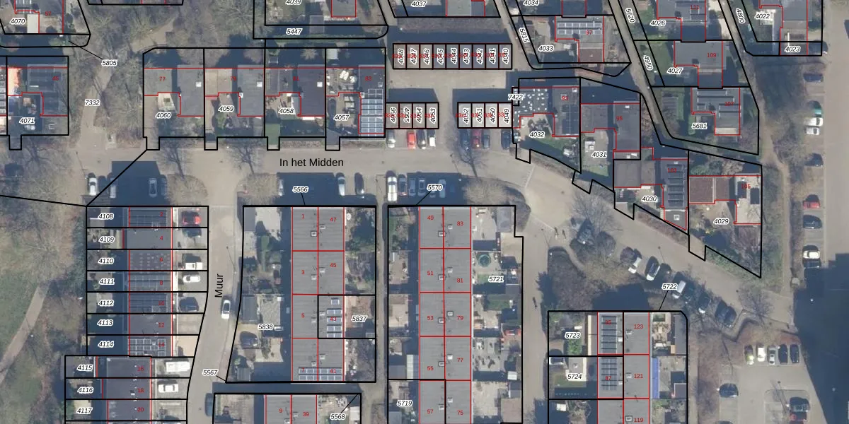 Het perceel waarop Muur 49 staat heeft een oppervlakte van 1472 m². Dit is een zeer groot perceel. De perceeloppervlakte wordt geregistreerd door het Kadaster. Gedetailleerde informatie over de maten van dit perceel kunt u vinden in het rapport Kadastrale kaart met maatvoering van Muur 49.