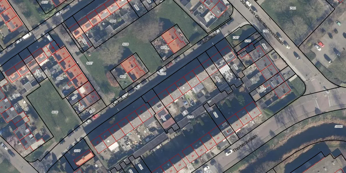 Het perceel waarop Talmalaan 13 staat heeft een oppervlakte van 5634 m². Dit is een zeer groot perceel. De perceeloppervlakte wordt geregistreerd door het Kadaster. Gedetailleerde informatie over de maten van dit perceel kunt u vinden in het rapport Kadastrale kaart met maatvoering van Talmalaan 13.