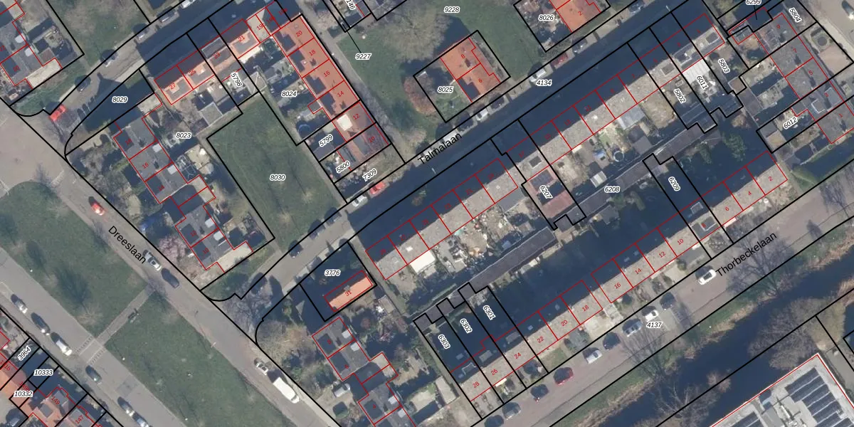 Het perceel waarop Talmalaan 25 staat heeft een oppervlakte van 5634 m². Dit is een zeer groot perceel. De perceeloppervlakte wordt geregistreerd door het Kadaster. Gedetailleerde informatie over de maten van dit perceel kunt u vinden in het rapport Kadastrale kaart met maatvoering van Talmalaan 25.