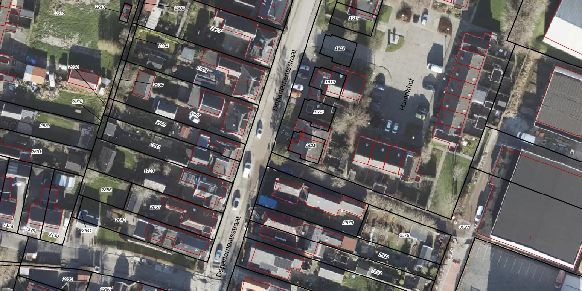 Het perceel waarop Departementsstraat 22 staat heeft een oppervlakte van 90 m². Dit is een klein perceel. De perceeloppervlakte wordt geregistreerd door het Kadaster. Gedetailleerde informatie over de maten van dit perceel kunt u vinden in het rapport Kadastrale kaart met maatvoering van Departementsstraat 22.