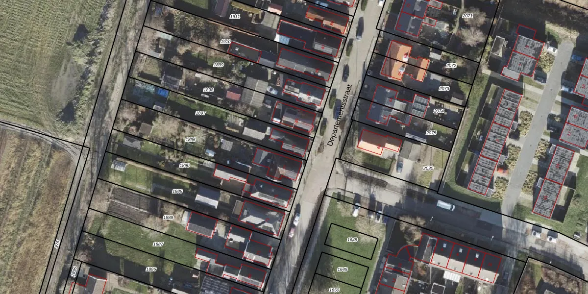Het perceel waarop Departementsstraat 79 staat heeft een oppervlakte van 530 m². Dit is een groot perceel. De perceeloppervlakte wordt geregistreerd door het Kadaster. Gedetailleerde informatie over de maten van dit perceel kunt u vinden in het rapport Kadastrale kaart met maatvoering van Departementsstraat 79.