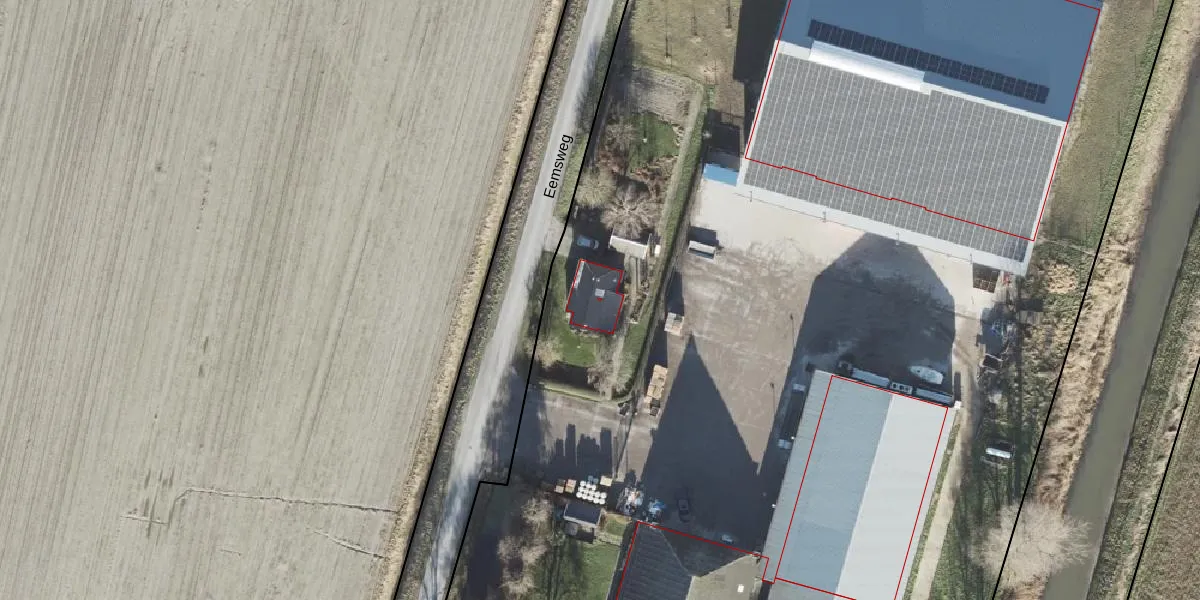 Het perceel waarop Eemsweg 4 staat heeft een oppervlakte van 4,0 ha. Dit is een zeer groot perceel. De perceeloppervlakte wordt geregistreerd door het Kadaster. Gedetailleerde informatie over de maten van dit perceel kunt u vinden in het rapport Kadastrale kaart met maatvoering van Eemsweg 4.