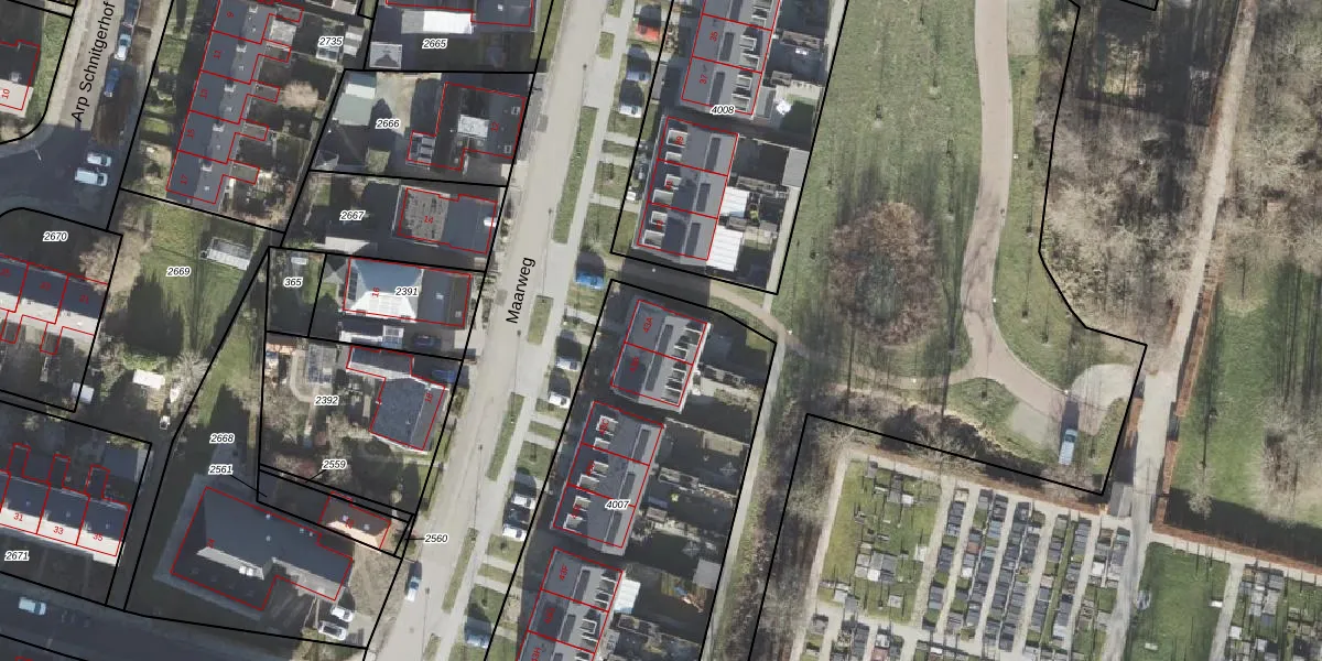 Het perceel waarop Maarweg 43-A staat heeft een oppervlakte van 1885 m². Dit is een zeer groot perceel. De perceeloppervlakte wordt geregistreerd door het Kadaster. Gedetailleerde informatie over de maten van dit perceel kunt u vinden in het rapport Kadastrale kaart met maatvoering van Maarweg 43-A.