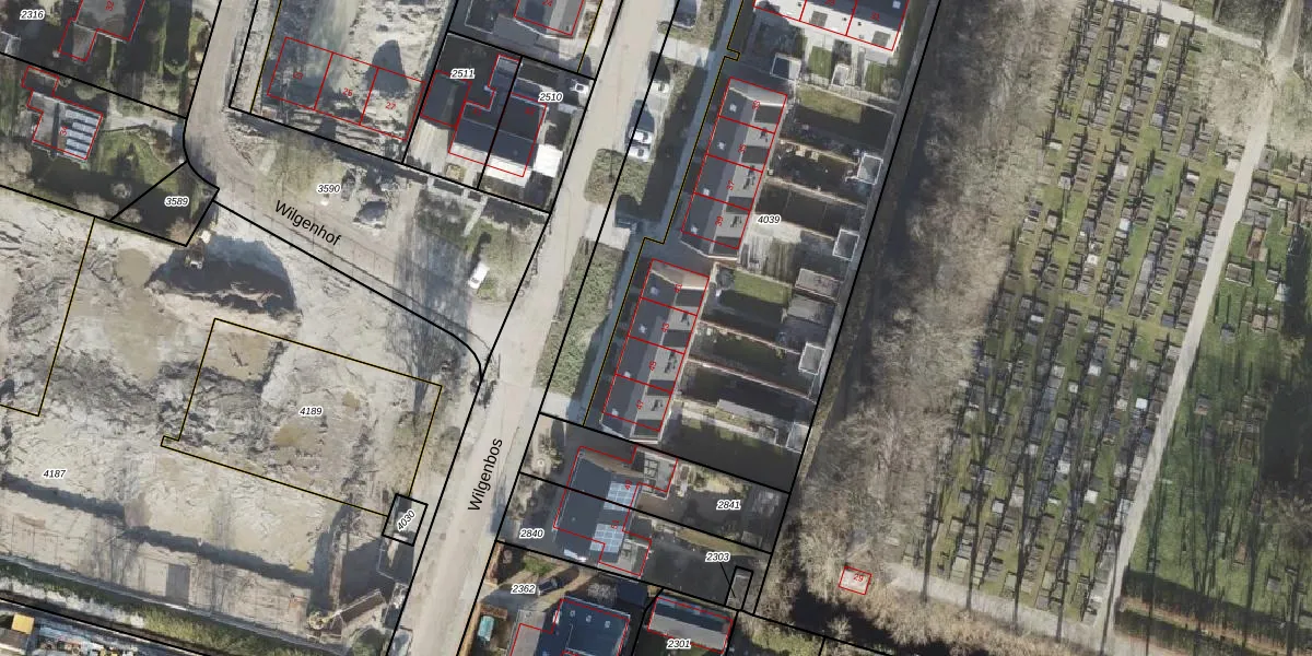 Het perceel waarop Wilgenbos 43 staat heeft een oppervlakte van 2447 m². Dit is een zeer groot perceel. De perceeloppervlakte wordt geregistreerd door het Kadaster. Gedetailleerde informatie over de maten van dit perceel kunt u vinden in het rapport Kadastrale kaart met maatvoering van Wilgenbos 43.