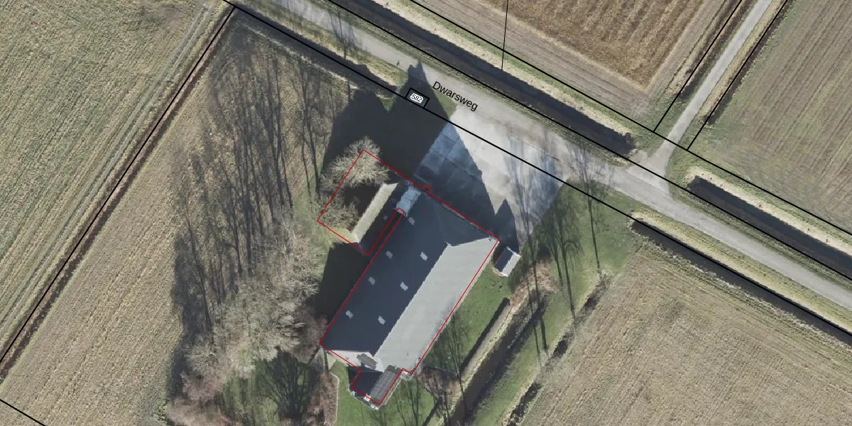Het perceel waarop Dwarsweg 1 staat heeft een oppervlakte van 2,3 ha. Dit is een zeer groot perceel. De perceeloppervlakte wordt geregistreerd door het Kadaster. Gedetailleerde informatie over de maten van dit perceel kunt u vinden in het rapport Kadastrale kaart met maatvoering van Dwarsweg 1.