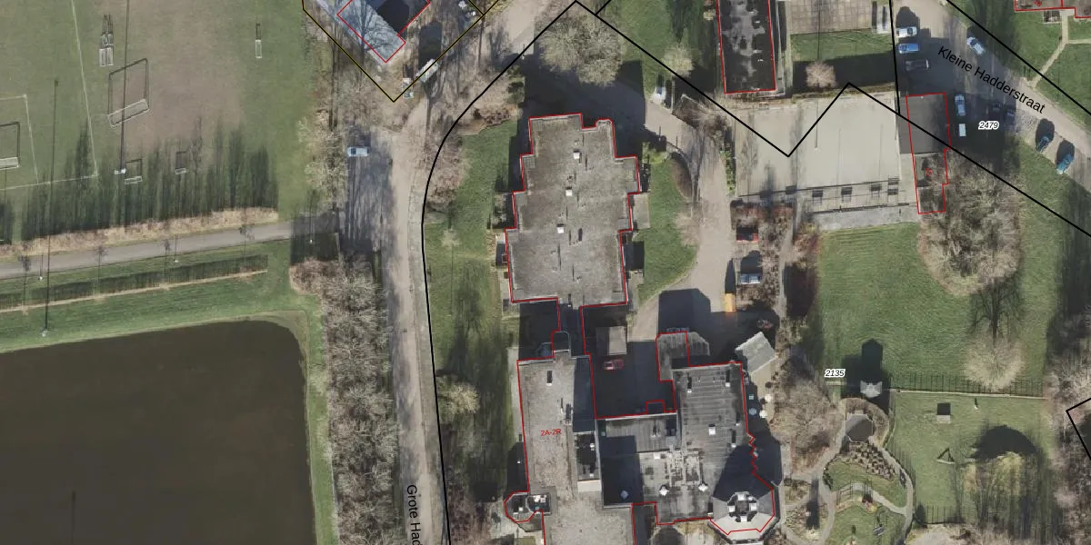 Het perceel waarop Grote Hadderstraat 2-R staat heeft een oppervlakte van 1,6 ha. Dit is een zeer groot perceel. De perceeloppervlakte wordt geregistreerd door het Kadaster. Gedetailleerde informatie over de maten van dit perceel kunt u vinden in het rapport Kadastrale kaart met maatvoering van Grote Hadderstraat 2-R.