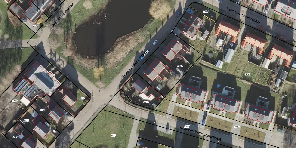Het perceel waarop Prinses Beatrixstraat 12 staat heeft een oppervlakte van 960 m². Dit is een groot perceel. De perceeloppervlakte wordt geregistreerd door het Kadaster. Gedetailleerde informatie over de maten van dit perceel kunt u vinden in het rapport Kadastrale kaart met maatvoering van Prinses Beatrixstraat 12.