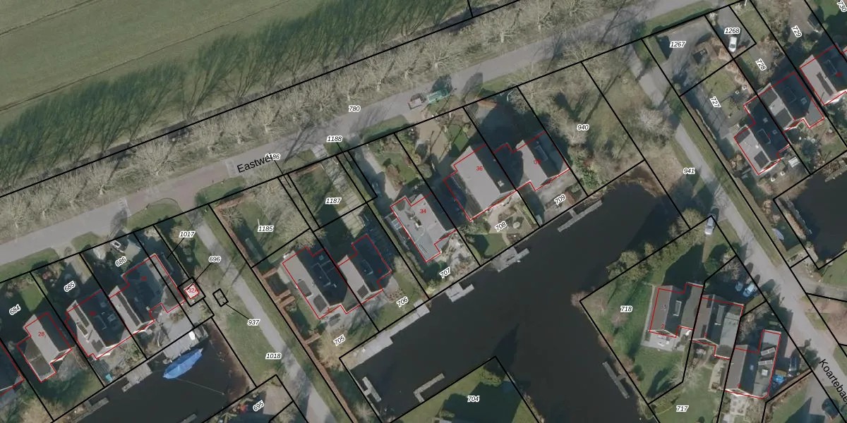 Het perceel waarop Eastwei 34 staat heeft een oppervlakte van 525 m². Dit is een groot perceel. De perceeloppervlakte wordt geregistreerd door het Kadaster. Gedetailleerde informatie over de maten van dit perceel kunt u vinden in het rapport Kadastrale kaart met maatvoering van Eastwei 34.
