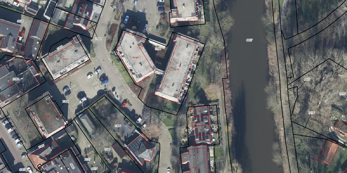 Het perceel waarop Allee 42 staat heeft een oppervlakte van 1550 m². Dit is een zeer groot perceel. De perceeloppervlakte wordt geregistreerd door het Kadaster. Gedetailleerde informatie over de maten van dit perceel kunt u vinden in het rapport Kadastrale kaart met maatvoering van Allee 42.