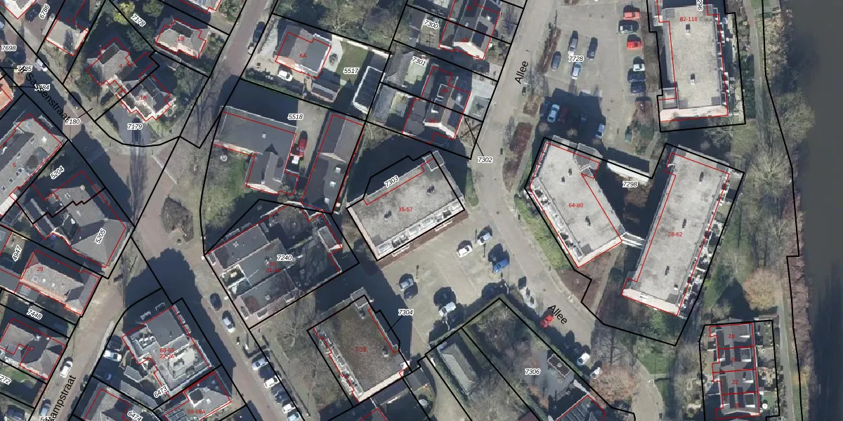 Het perceel waarop Allee 47 staat heeft een oppervlakte van 380 m². Dit is een groot perceel. De perceeloppervlakte wordt geregistreerd door het Kadaster. Gedetailleerde informatie over de maten van dit perceel kunt u vinden in het rapport Kadastrale kaart met maatvoering van Allee 47.