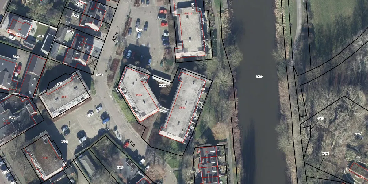 Het perceel waarop Allee 60 staat heeft een oppervlakte van 1550 m². Dit is een zeer groot perceel. De perceeloppervlakte wordt geregistreerd door het Kadaster. Gedetailleerde informatie over de maten van dit perceel kunt u vinden in het rapport Kadastrale kaart met maatvoering van Allee 60.