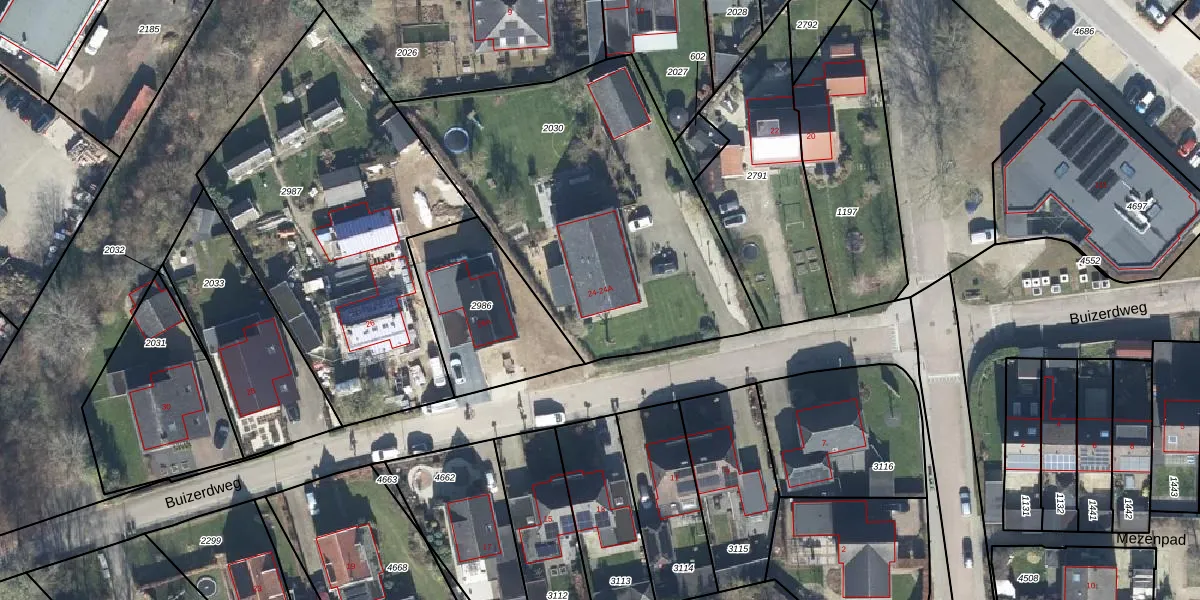 Buizerdweg 24 is gelegen op kadastraal perceel GDG00M2030. Deze kadastrale aanduiding is uniek en wordt gebruikt door het Kadaster om eigendomsrechten en andere zakelijke rechten vast te leggen. Het perceel maakt onderdeel uit van de kadastrale gemeente Gendringen.