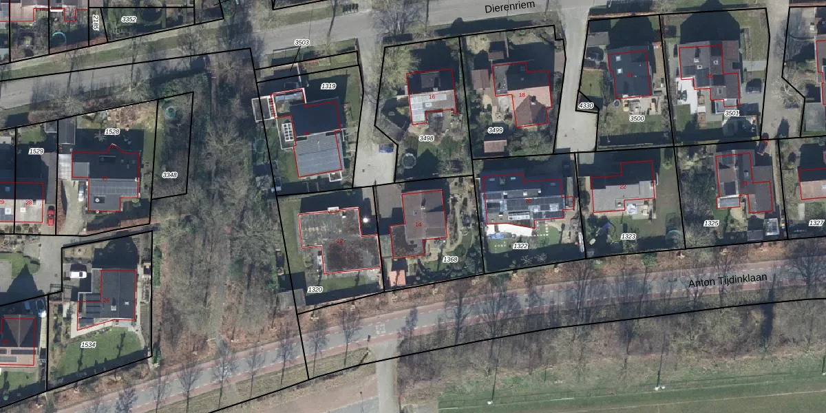 Het perceel waarop Dierenriem 14 staat heeft een oppervlakte van 607 m². Dit is een groot perceel. De perceeloppervlakte wordt geregistreerd door het Kadaster. Gedetailleerde informatie over de maten van dit perceel kunt u vinden in het rapport Kadastrale kaart met maatvoering van Dierenriem 14.