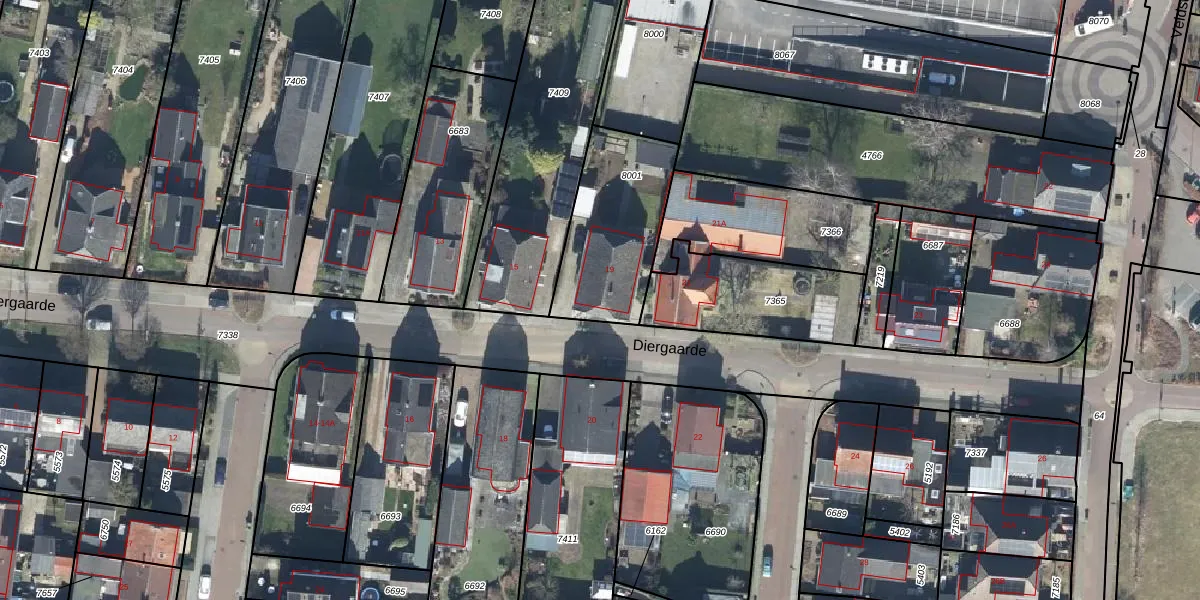 Het perceel waarop Diergaarde 19 staat heeft een oppervlakte van 468 m². Dit is een groot perceel. De perceeloppervlakte wordt geregistreerd door het Kadaster. Gedetailleerde informatie over de maten van dit perceel kunt u vinden in het rapport Kadastrale kaart met maatvoering van Diergaarde 19.