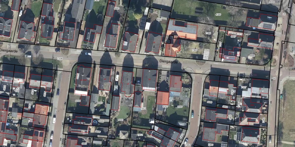 Het perceel waarop Diergaarde 20 staat heeft een oppervlakte van 615 m². Dit is een groot perceel. De perceeloppervlakte wordt geregistreerd door het Kadaster. Gedetailleerde informatie over de maten van dit perceel kunt u vinden in het rapport Kadastrale kaart met maatvoering van Diergaarde 20.