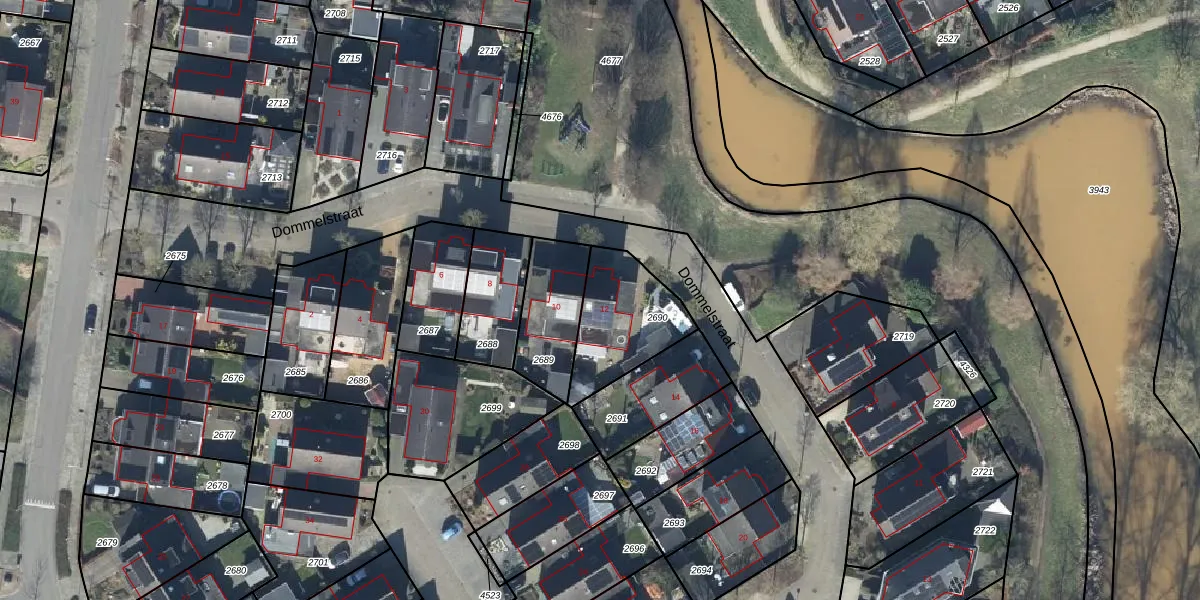 Het perceel waarop Dommelstraat 12 staat heeft een oppervlakte van 320 m². Dit is een groot perceel. De perceeloppervlakte wordt geregistreerd door het Kadaster. Gedetailleerde informatie over de maten van dit perceel kunt u vinden in het rapport Kadastrale kaart met maatvoering van Dommelstraat 12.
