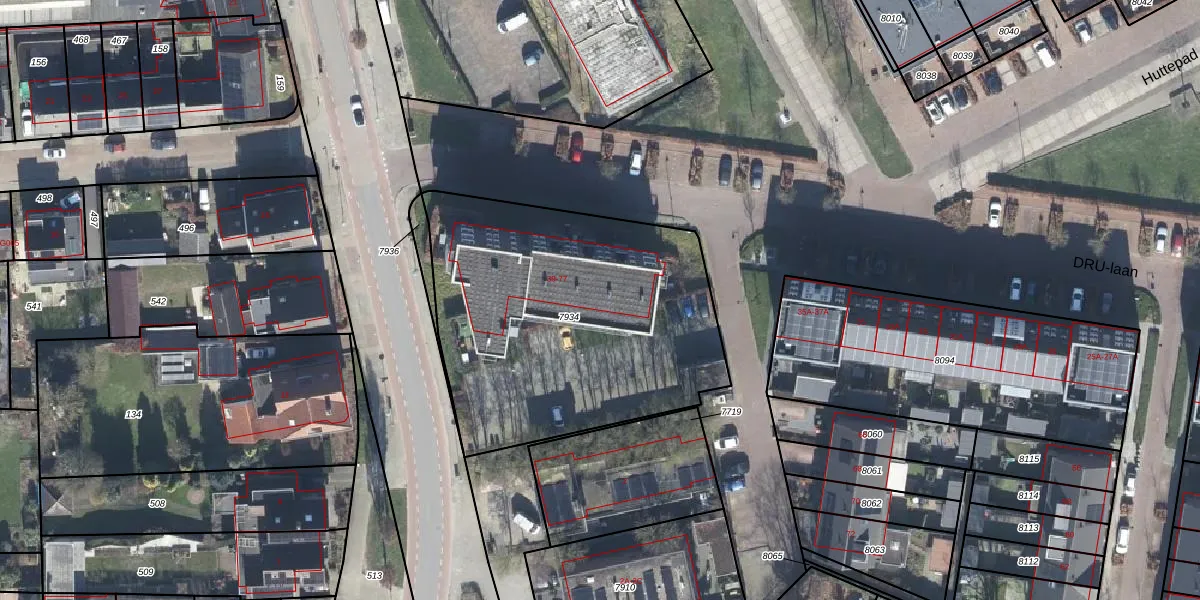 Het perceel waarop DRU-laan 65 staat heeft een oppervlakte van 1658 m². Dit is een zeer groot perceel. De perceeloppervlakte wordt geregistreerd door het Kadaster. Gedetailleerde informatie over de maten van dit perceel kunt u vinden in het rapport Kadastrale kaart met maatvoering van DRU-laan 65.