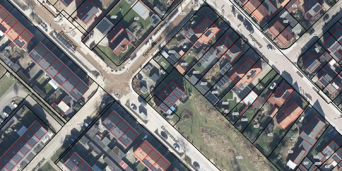 Het perceel waarop Eksterstraat 36 staat heeft een oppervlakte van 2365 m². Dit is een zeer groot perceel. De perceeloppervlakte wordt geregistreerd door het Kadaster. Gedetailleerde informatie over de maten van dit perceel kunt u vinden in het rapport Kadastrale kaart met maatvoering van Eksterstraat 36.