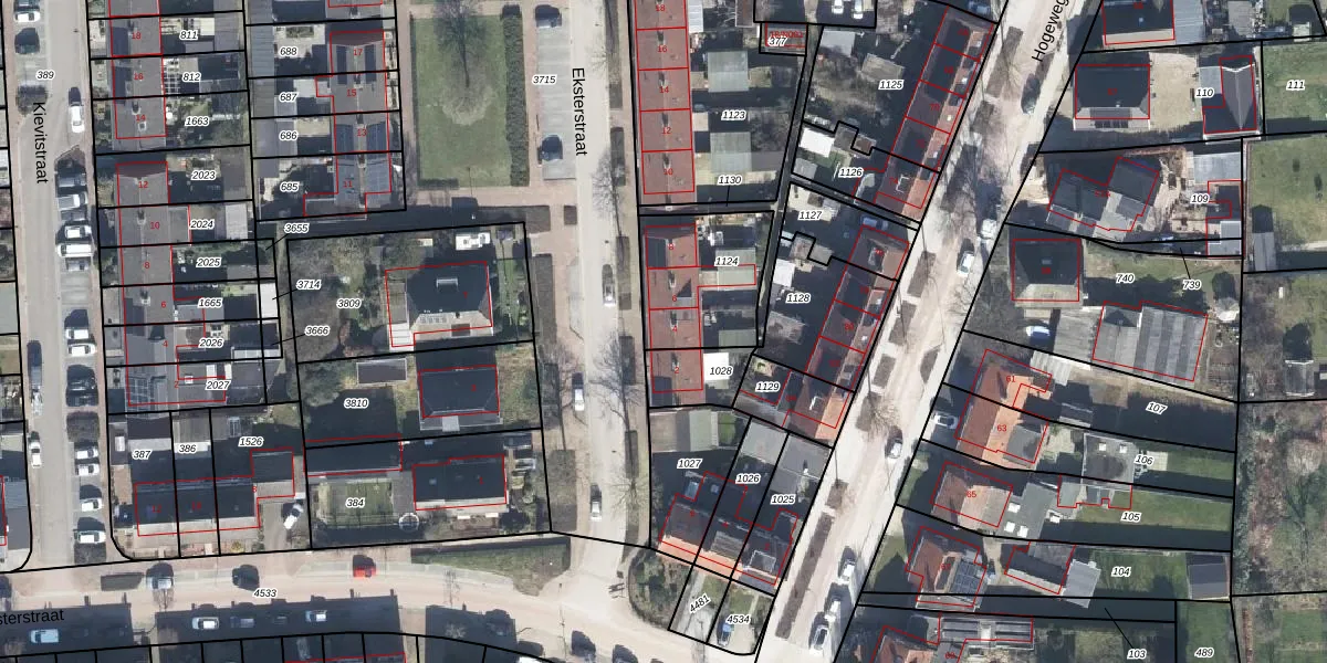 Het perceel waarop Eksterstraat 4 staat heeft een oppervlakte van 365 m². Dit is een groot perceel. De perceeloppervlakte wordt geregistreerd door het Kadaster. Gedetailleerde informatie over de maten van dit perceel kunt u vinden in het rapport Kadastrale kaart met maatvoering van Eksterstraat 4.