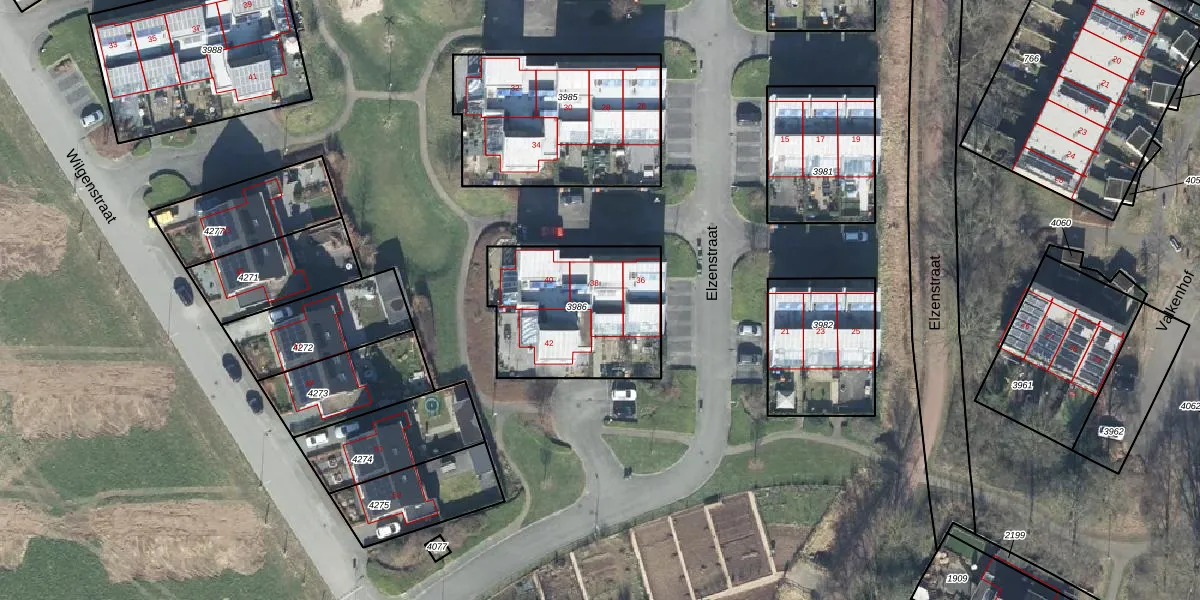 Het perceel waarop Elzenstraat 38 staat heeft een oppervlakte van 617 m². Dit is een groot perceel. De perceeloppervlakte wordt geregistreerd door het Kadaster. Gedetailleerde informatie over de maten van dit perceel kunt u vinden in het rapport Kadastrale kaart met maatvoering van Elzenstraat 38.