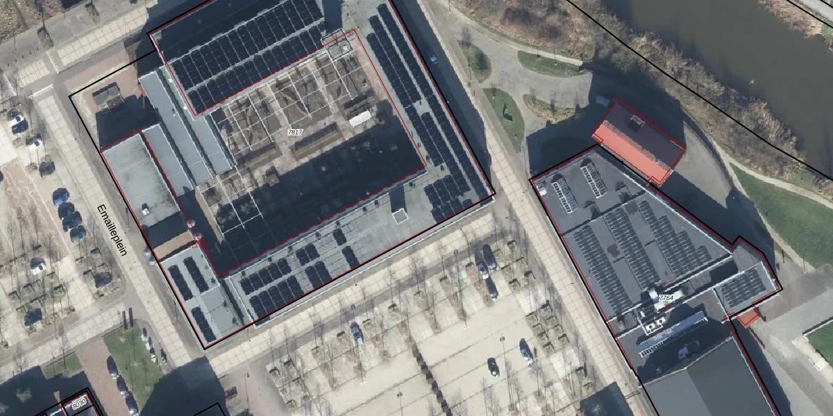 Het perceel waarop Emailleplein 20 staat heeft een oppervlakte van 5655 m². Dit is een zeer groot perceel. De perceeloppervlakte wordt geregistreerd door het Kadaster. Gedetailleerde informatie over de maten van dit perceel kunt u vinden in het rapport Kadastrale kaart met maatvoering van Emailleplein 20.